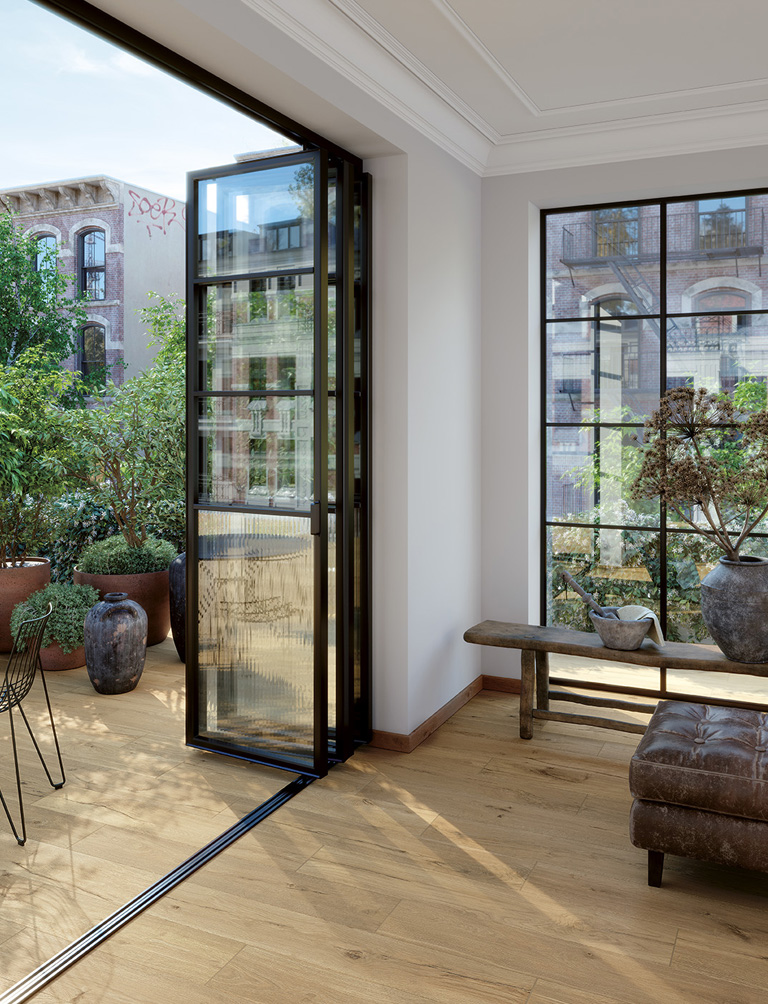 You can also decorate the room with wall tiles on a botanical or floral theme: tiles with natural textures, featuring dynamic patterns, 3D decorations and glossy inserts able to recreate an authentic indoor landscape; just a few elements will suffice, thanks to the large 80x160 size. You’ll find a rich catalogue of decorative, smart maxi tiles with patterns ranging from jungle style to romantic chic!