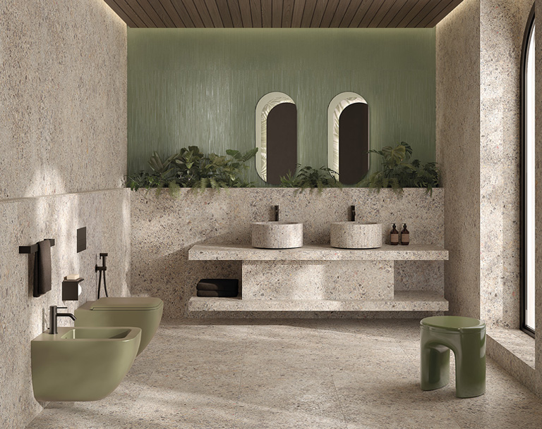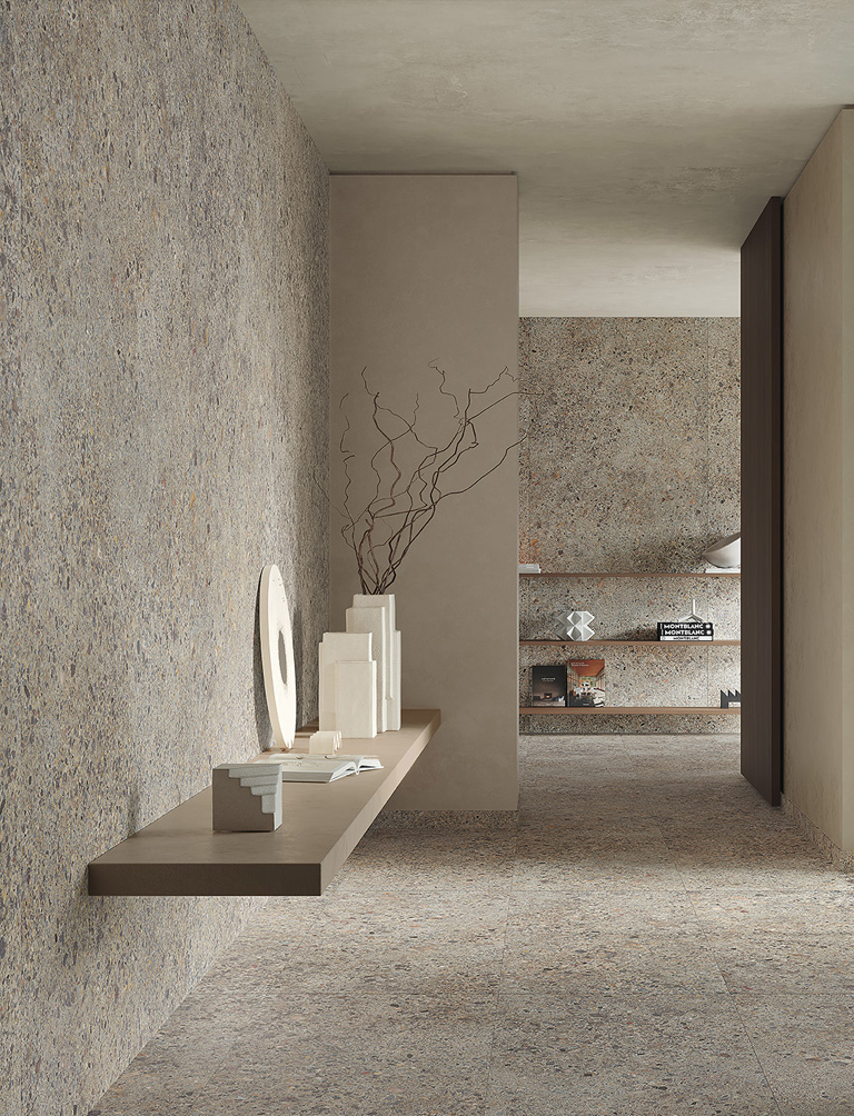 Matter takes on the appearance of a strong, dense, dry conglomerate. The consistency of every single pebble and fragment set into the stoneware is perceptible to the fingertips thanks to the true touch treatment, and changes visually with the colour variations that soften the surfaces’ brutalist and biophilic character.