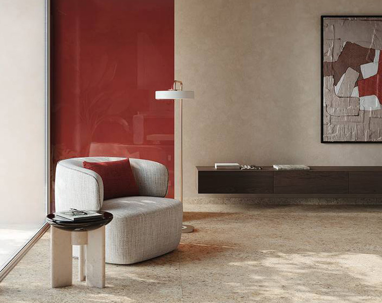 The tactile, rough Materia Eclettica surfaces are still full of style and enable surprising, new hybridisation with other MATERIA collections, combining concrete, rock, raw and polished stone and ultra-glossy, colourful features.