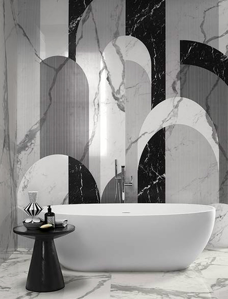 Pinterest Predicts also features the circus home: two-tone striped upholstery, furnishings inspired by the world of clowns and jugglers and moods that are spectacular but always controlled, like the pigments on the surfaces of Materia Brillante Gocce Bianco, a wall tile with a hugely playful theme that also appears on the floor with FAP Maxxi Superdrop White, stoneware slabs in 120x278 size, characterised by their matt and glossy multicoloured dots.