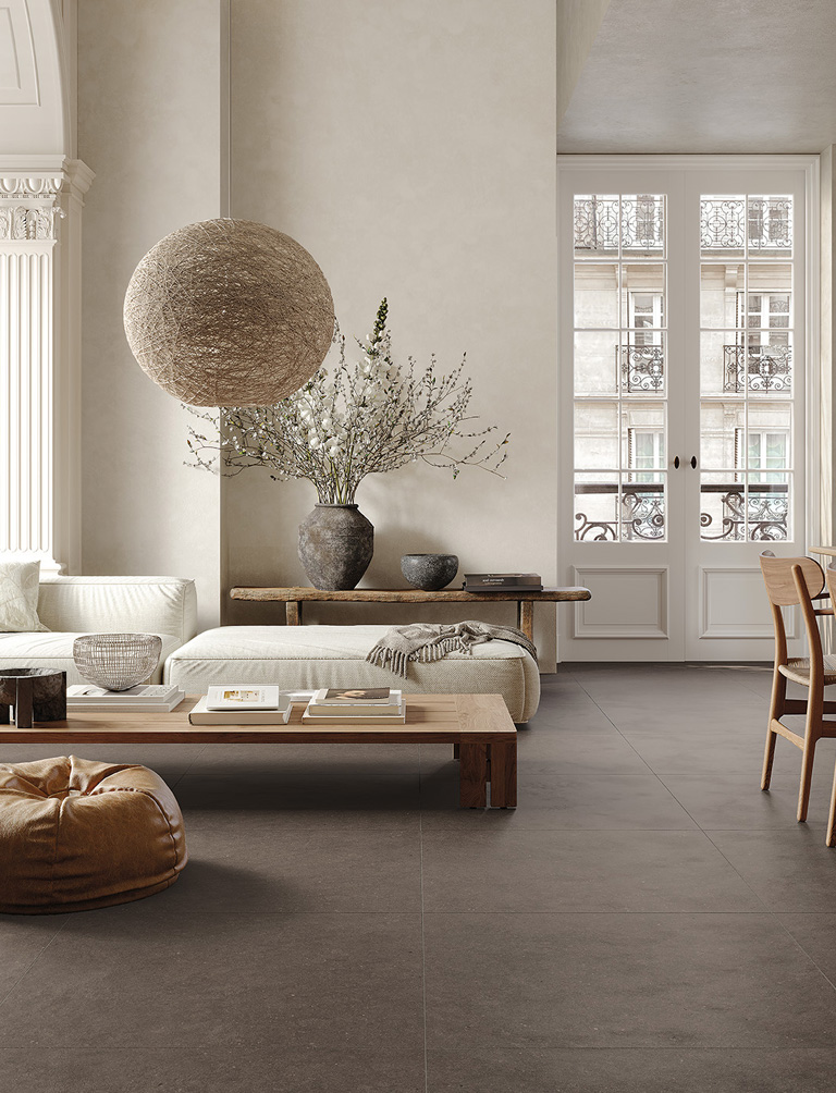 In the most sophisticated interior design trends, luxury is understated and never blatant. Dark floorings like those of Materia Pura Terra in porcelain stoneware, matt, tactile surfaces and deep, velvety finishes redefine the idea of contemporary elegance.