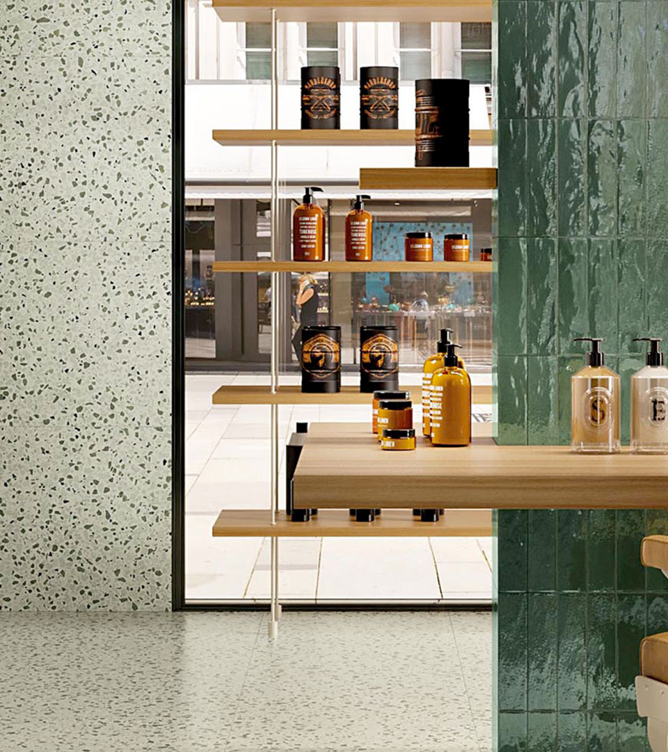 GLIM also offers a vibrant range of colours that joyfully reinterpret Venetian terrazzo-effect floor tiles, which are made livelier and more modern through carefully selected colours like Gemme Blue, Gemme Pink, Gemme Sage, Gemme Beige and Gemme White! This delightful blend of colours and ceramic effects can also be applied to walls or used as a unique flooring option for bathrooms.