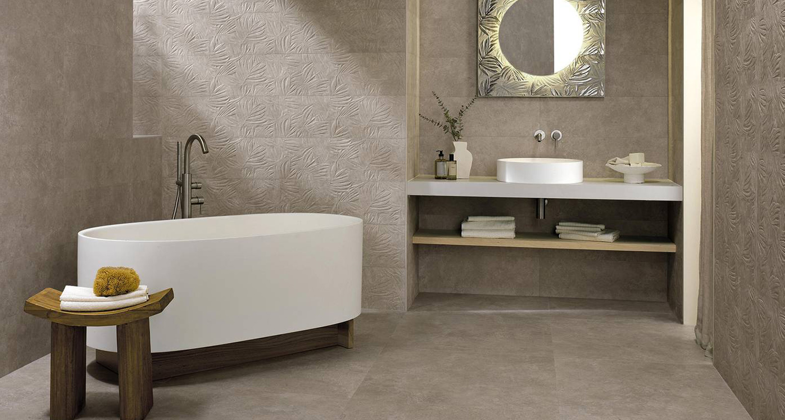 The transition from the bathroom to the master bedroom can be styled in tactile shapes with Nobu, a stone-effect stoneware wall tile with an extremely natural, material look that brings a subtle touch of elegance.