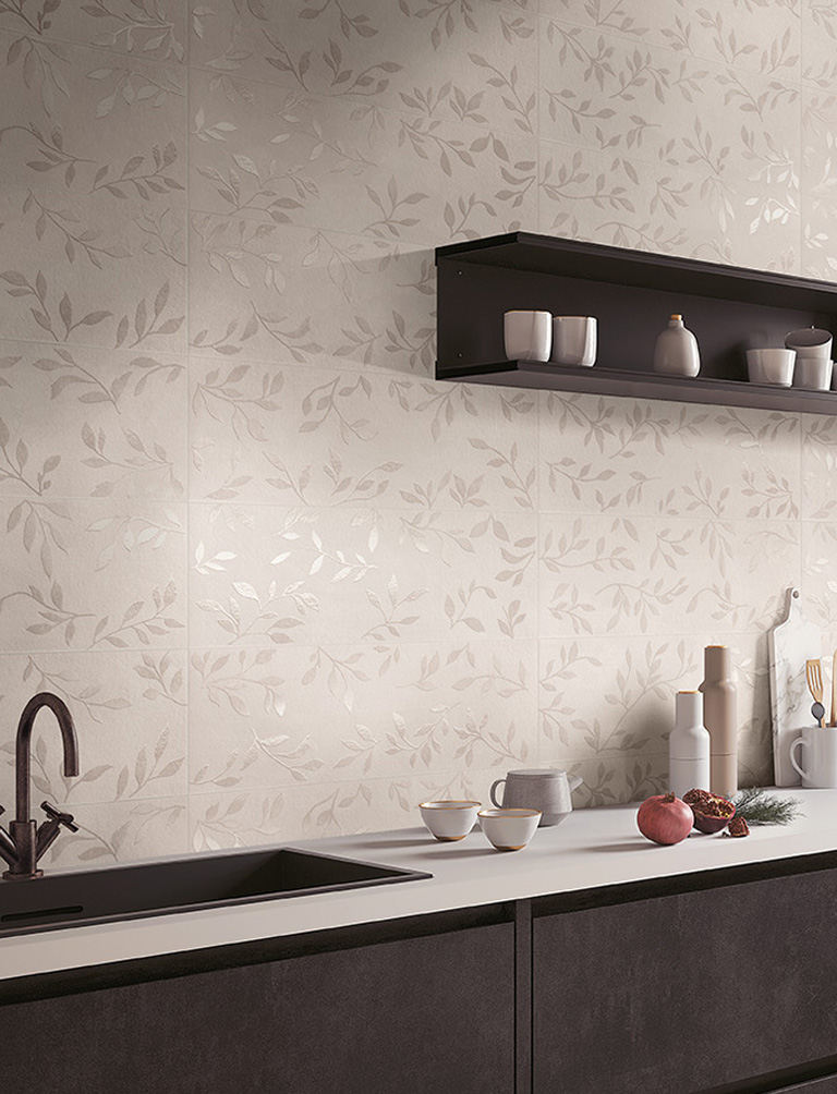 It can still be decorated with Art and Imagination, thanks to stoneware and ceramic wall tiles that team performance with decorative beauty, such as Deco & More Ramage White (25x75), a splendid glossy pattern inspired by nature that glides across a matt background.