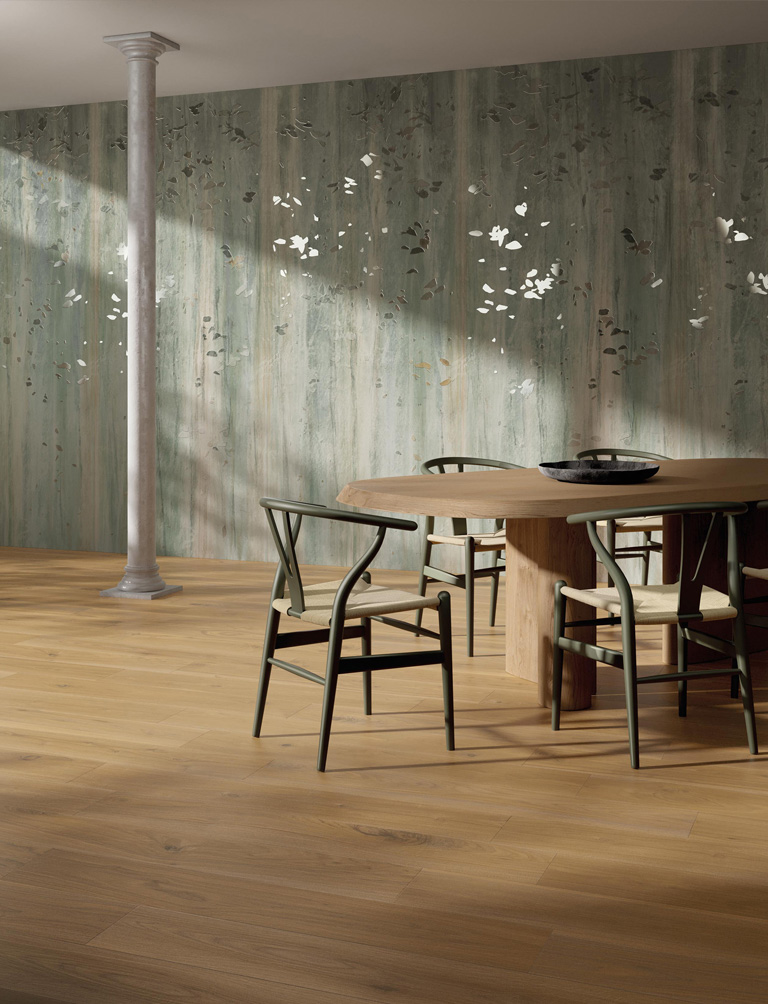 These large (120x278) porcelain stoneware tiles create the impression of a living space that opens out onto the greenery, lit up by the glimmer of the little glossy relief effects.