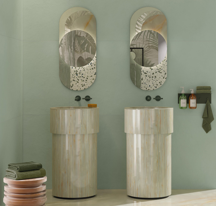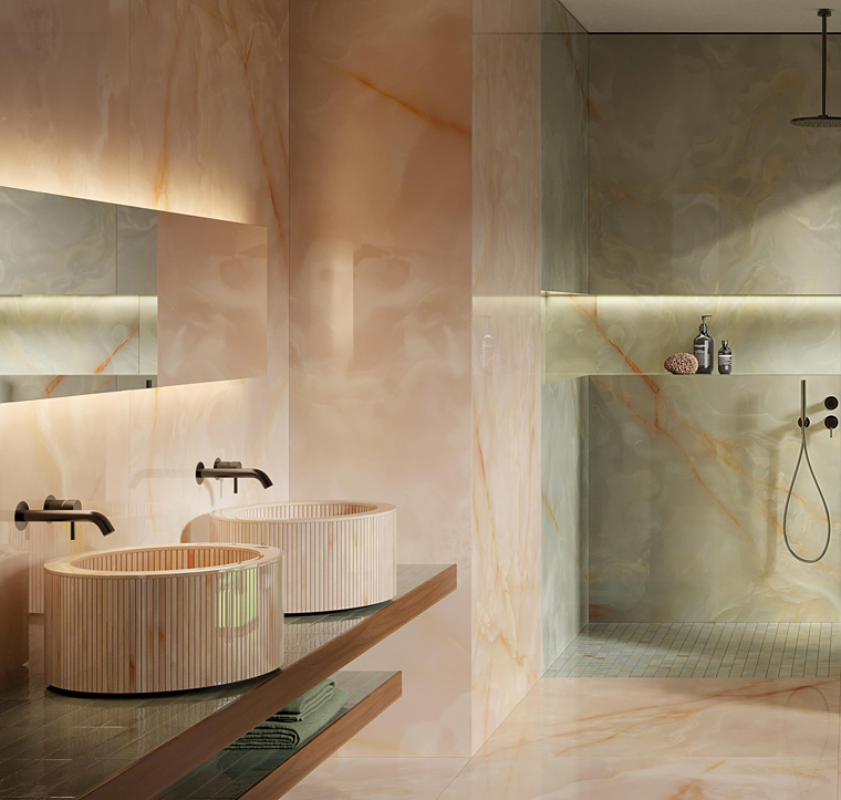 This furnishing accessory ensures maximum practicality, durability and safety while showcasing all the exquisite beauty of the Gemme collection’s onyx-effect stoneware tiles in the colours Cielo, Rosa, Menta, Beige and Bianco.
