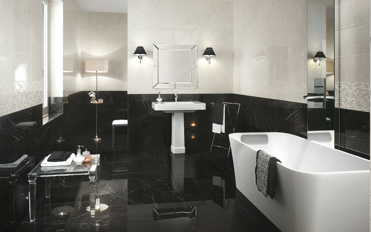 Seductive and enigmatic like a New Moon, Nero Reale is featured in the Roma Diamond collection, an exclusive series of white body and glossy marble-effect porcelain stoneware floor and wall tiles.