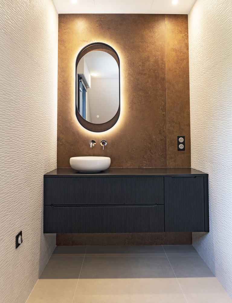 The bathrooms also feature the tactile, highly decorative surfaces of SHEER and BLOOM, collections of 3D white-body tiles in 80 x 160 size.