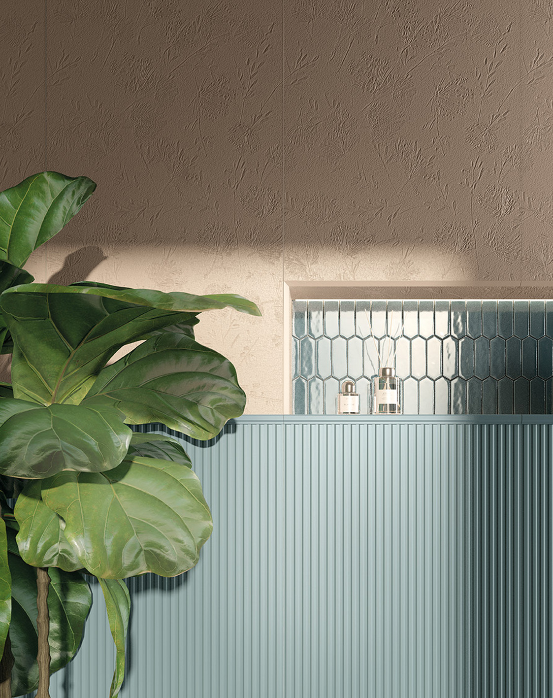 Ricchezza di formati, colori neutri e contemporanei in finitura matt, pezzi speciali coordinati, boiserie e una serie di piastrelle decorative per definire spazi e angoli speciali, dal mosaico esagonale al macromosaico, fino alle lastre decorate in stile tropicale.